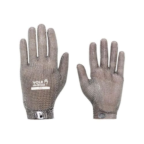 Luva malha de aço inoxidavel pulseira em aço steel volk c.A 26967 Tamanho: m 8 Descrição do produto: luva de segurança confeccionada em malha de aço inoxidável, fio com diâmetro de 0,55 mm e anéis com diâmetro interno de 2,9 mm e externo de 4,0 mm com pulseira malha aço inox para fechamento e ajuste no punho, curta, cinco dedos. Tamanhos correspondentes às cores: marrom xxs , verde xs , branca s , vermelha m , azul l , laranja xl e verde oliva xxl .