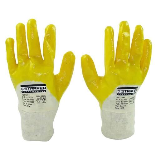 Características técnicas: Confeccionada em malha de algodão tricotada em uma só peça. Revestimento nitrílico na face palmar e 3/4 plantar. Punho elástico. Certificado de aprovação: CA Nº 49.472. Tamanho: 9/G. Cores: Palma, ponta dos dedos e parcial dorso amarela e parcial dorso e punho bege. Normas técnicas: EN 407:2004, BS EN 388:2016 + A1:2018, ISO 21420:2020 Níveis de desempenho: 3111X, X1XXXX Ref.: 7971303 Marca: Starfer