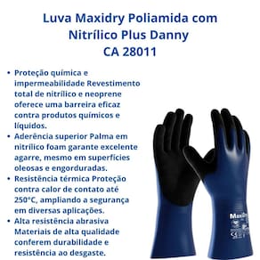 Luva Maxidry Poliamida com Nitrílico Plus Danny CA 28011 Proteção Química e Térmica Superior A Luva Maxidry Plus Danny é confeccionada em nylon e elastano, com um revestimento total de nitrílico e neoprene, o que a torna completamente impermeável e ideal para o manuseio de uma ampla variedade de produtos químicos perigosos. Além disso, conta com um banho na palma e dedos em nitrílico foam, proporcionando excelente aderência, especialmente em trabalhos com óleos e graxas. Seu formato anatômico garante maior conforto durante o uso prolongado, e sua alta resistência abrasiva, somada à proteção térmica de até 250°C, a torna uma solução versátil e segura.