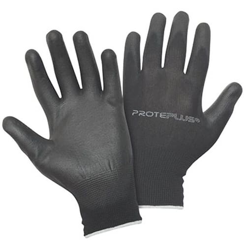 - Luva de segurança confeccionada em fios de poliéster, revestimento em poliuretano na palma, face palmar e pontas dos dedos. Punho com acabamento tricotado em elastano e costuras overloque.