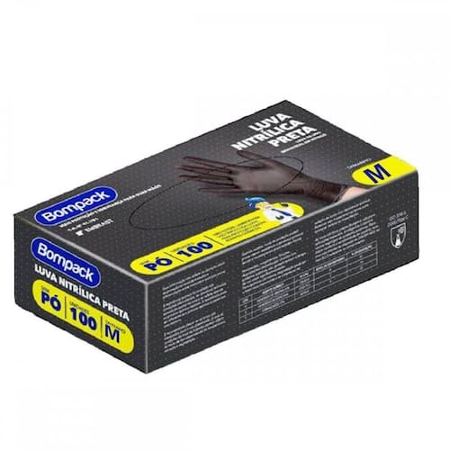 Luva Procedimentos Nitrílica Preta Sem Pó Tamanho M Caixa com 100 Unidades BomPack