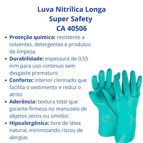Adquira já sua Luva Nitrílica Longa Super Safety CA 40506 e garanta máxima proteção e conforto em suas atividades de trabalho!