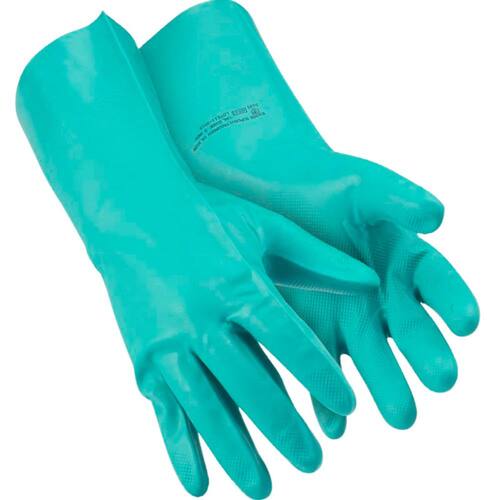A luva de segurança em borracha nitrílica 100 % texturizada oferece proteção eficiente contra agentes químicos e riscos mecânicos, com acabamento clorinado que facilita o calce e impede o ingresso de contaminantes.