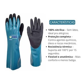 Principais vantagens e benefícios - 100% nitrílica: livre de proteínas do látex. - proteção completa: contra agentes químicos, mecânicos, óleos e graxas. - resistência térmica de até 100c: com intermitência de 15 segundos. - impermeável e antiderrapante: revestimento total com ótima aderência. - flexível e anatômica: mais conforto e performance no uso contínuo.