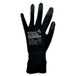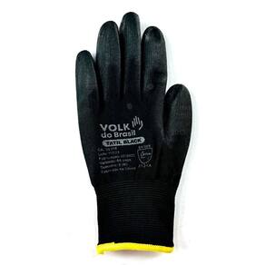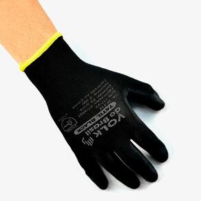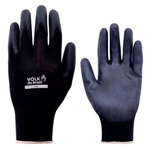 Luva de segurança confeccionada em fibras sintéticas, revestimento da face palmar e ponta dos dedos em poliuretano (PU), punho com inserções de fibras elásticas e acabamento em fibras sintéticas.