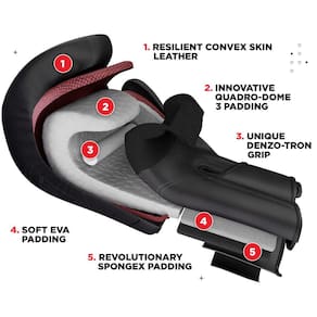 As luvas de boxe da série RDX Kara são fabricadas com couro Maya Hide ConveX Skin para durabilidade e resiliência prolongadas durante sessões de treinamento e treino de boxe, Muay Thai e kickboxing, entre outros esportes es. O design Loma Tech (patente pendente) fornece suporte aprimorado para a formação e alinhamento do punho e do pulso para uma técnica de punção muito mais precisa. O acolchoamento Quadro Dome 3 combina com espuma de EVA macia e acolchoamento SpongeX para difundir o peso da força dos socos, enquanto a barra de aderência Denzo-tron nas luvas de boxe inteligentes para homens e mulheres permite que o usuário feche o punho para dar melhores socos. O painel de malha na área da palma mantém as luvas de treino secas por dentro, permitindo que o ar flua, enquanto o fecho de Quick-EZ facilita muito a colocação ou retirada das luvas de treinamento. A costura dupla em toda a estrutura torna as luvas de boxe da série RDX Kara altamente duráveis e resistentes para uso a longo prazo em treinamento.