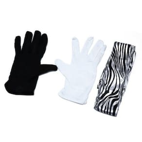 O mágico entra no palco com uma mão com luva branca e outra com luva preta. Cruza as mãos e retira as luvas e joga ao alto, transformando tudo em uma fita de seda em zebra. Lindo efeito, fácil de fazer.