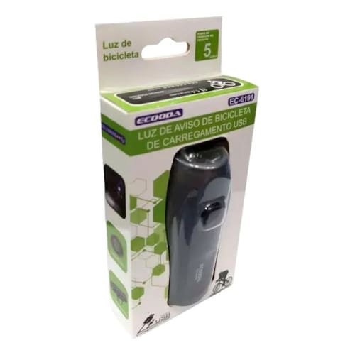 Instalado na frente da bicicleta. Carregamento USB. Possui uma certa função à prova d'água. Distância do feixe: 120m