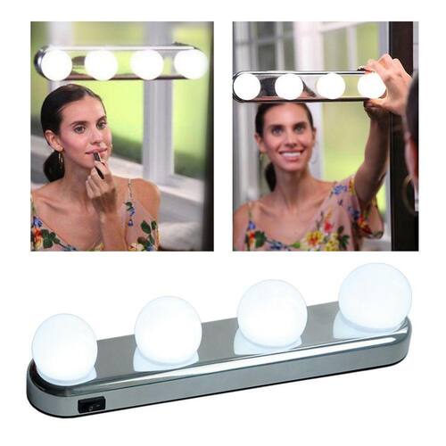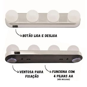 Luz de espelho led 4 lampadas studio glow Luz de led para espelho camarim Chegou o novo led com formato de lâmpada que vai salvar a sua vida na hora de se maquear, arrumar o cabelo e até mesmo para tirar lindas e iluminadas fotosPossui um design extremamente moderno, que decora e embeleza o ambiente onde é colocad, além de ser super prático e fácil de usar. Não esquenta e não necessita estar conectado na tomada, essa luz led é alimentada via pilhas e possui lampadas de longuissima vida útil, a energia da sua casa pode acabar que você ainda irá poder se produzir para seu evento Especificações: - formato de lâmpada;- alimentação: 4 pilhas aa não inclusas ; - ventosas para fixação; - medidas: 30x6cm;- material: aço inox e plástico;Conteúdo da embalagem: 01 luz de led para espelho camarim Obs: acompanha lâmpadas Marca: Utc