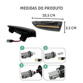 Características: - Material: Plástico ABS e LED; - Tamanho: 7,8 cm x 3,3 cm (igual ao autêntico); - Cor da lente: Transparente; - Cor do Led âmbar, tom padrão de acionamento. - Quantidade: 2 Unidades; - 100% à prova d'água.