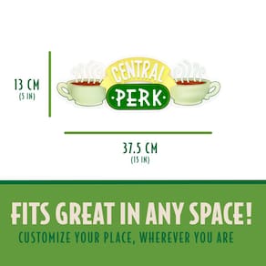 - Detalhes: A luz neon central Perk vem com um suporte de parede. Mede aproximadamente 38 cm de largura e 13 cm de altura. Ele também vem com um cabo USB para alimentar a luz.