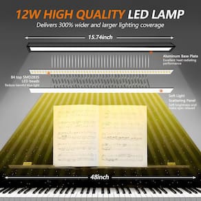 - Luz de piano LED de alta qualidade de 12 W: incorporando contas de LED 2835 de alta qualidade, a luz emitida cobre uniformemente todo o teclado do piano, garantindo uma iluminação eficiente. A luz do piano minimiza efetivamente a luz azul que pode prejudicar seus olhos, reduzindo o cansaço visual e o desconforto. Este recurso ajuda a manter o conforto durante longas sessões de treino ou horas de trabalho, evitando a fadiga. Ideal para tocar piano, ler, estudar, trabalhar, trabalhar, costurar e muito mais