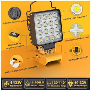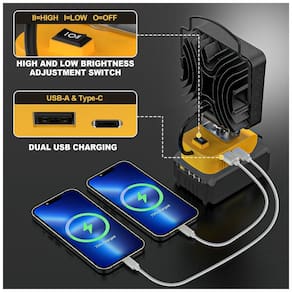 COMPATÍVEL COM BATERIA DEWALT Compatível com baterias de íon de lítio da série DeWALT 20V, 18V, como dewalt dcb200 dcb201 dcb203 dcb204 dcb205 dcb206 etc. PROJETO DE SEGURANÇA As luzes de trabalho LED usb codlress são projetadas com um interruptor de 2 marchas, que pode controlar o brilho alto e baixo separadamente, para atender às diferentes cenas. Esta luz de loja alimentada por bateria possui um painel de proteção de baixa tensão embutido para proteger sua bateria contra danos. Ela cortará automaticamente a energia quando a tensão cair abaixo de 14,5V. CABEÇA GIRATÓRIA A lanterna LED sem fio possui design giratório de 0 a 140 graus. Ele pode se adaptar a diferentes cenários de trabalho e necessidades de iluminação em diferentes direções. CENÁRIOS DE USO MÚLTIPLO A luz de trabalho sem fio pode ser usada em uma variedade de configurações, como sua loja, celeiro, trailer, sala de estar, quintal ou quando você está acampando e fazendo um churrasco ou qualquer outro ambiente escuro. Possui portas de carregamento USB A e Type C e também pode atender às suas necessidades de carregamento de dispositivos móveis Marca: Não Informado