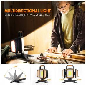 A luz de trabalho LED recarregável TRESDA tem duas luzes laterais ajustáveis, pode ser flexível 180 dobrada para trás, a luz principal suporta rotação vertical de 180 e 360 horizontal, fornecendo iluminação omnidirecional para o seu local de trabalho, atende a todos os requisitos de iluminação multidirecional desejados.