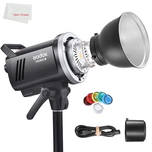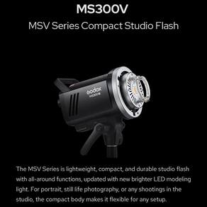 Godox 1 flash MS300V - ? GODOX MS300V flash de estúdio leve, compacto e multiuso atualizado com uma nova luz de modelagem LED mais brilhante. - ? GODOX 2,4G integrado, use o gatilho opcional x2, XT16 ou FT-16 para controlar a taxa de potência do flash, luz de modelagem e campainha, também pode ser utilizado como um gatilho de flash. - ? Corpo compacto e leve com suporte Bowens, você pode adicionar quase qualquer modelador de luz de estúdio. - ? A lâmpada de modelagem de 10 W pode ser ajustada no nível de potência de 5% a 100%, excelente estabilidade de saída, não mais do que 2% de deslocamento na mesma saída. - ? A função anti-flash pode ser sincronizada com câmeras que têm um único sistema de pré-flash; automaticamente lembra e restaura as configurações ajustadas do painel.