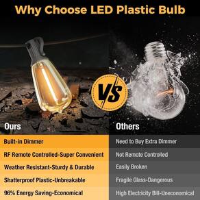 Transforme seu espaço ao ar livre em um oásis de tirar o fôlego com as luzes brancas quentes à prova d'água da Litogo. Você ficará encantado com a atmosfera aconchegante e convidativa que eles criam, tornando reuniões, festas, casamentos ou outros eventos ainda mais mágicos. Estas luzes de corda ecológicas com lâmpadas LED de eficiência energética fornecem iluminação brilhante e vibrante que pode suportar qualquer condição climática com seu design impermeável e durável. Eleve seu espaço ao ar livre com estas luzes cativantes para pendurar no pátio e dê vida à sua visão. Seus convidados ficarão impressionados com sua iluminação deslumbrante. Feitas com materiais duráveis e um design à prova d'água, estas cordas de luzes são construídas para durar e podem suportar elementos externos como chuva, neve e umidade para uso duradouro. Estas luzes para pendurar no pátio com controle remoto RF são uma adição elegante e funcional à sua decoração externa, proporcionando uma atmosfera aconchegante e convidativa para qualquer ocasião, seja um evento especial ou uso diário. Adicione um toque de charme à sua casa com estas luzes de corda cativantes. Especificação: Multifunção: Controle remoto com regulador de intensidade de luz embutido Comprimento do cabo: 120 FT Tipo de lâmpada: Lâmpadas LED ST38 com base E12 Quantidade: 50+2 peças de reposição Dimensão: 3,8 cm Altura: 9,2 cm Vida útil: 30.000 horas Tipo de plugue: plugue de 2 pinos Cor de iluminação: 2700K branco quente - ?Controle remoto conveniente?Possui um regulador de intensidade de controle remoto embutido, permitindo que você ajuste facilmente o brilho para se adequar a qualquer ocasião. Aproveite as opções de temporizador de 3 horas e 6 horas, garantindo que as luzes do pátio se apaguem automaticamente. Com 5 modos de iluminação, incluindo Always On, Slow Fade, Flash, Jump, e Breathing, você pode criar a atmosfera perfeita para festas, reuniões e ambiente diário - ?Mais longa e baixa tensão?As luzes de corda externa extralongas de 120 pés são equipadas com 50 lâmpadas Edison atualizadas à prova de estilhaçamento (incluindo 2 lâmpadas sobressalentes), que podem ser conectadas a até 3 fios facilmente. Alimentado por um transformador de saída de baixa tensão de 24V, as cordas de luzes litogo bistrô são mais seguras do que as luzes de corda de alta pressão. Elas são seguras ao toque sem se preocupar com choque elétrico - ?Durável e à prova de intempéries?Nossas luzes para pendurar ao ar livre são duráveis e à prova de intempéries. Com lâmpadas brancas quentes 2700K à prova de estilhaçamento feitas de material PET forte, elas são feitas para durar. Com tecnologia à prova de intempéries recém-atualizada, estas luzes de corda de deck podem suportar temperaturas extremas, chuva, vento, neve e umidade. Você pode deixar as luzes da varanda do lado de fora o ano todo sem preocupações - ?Economia de energia e superconveniente?Com cada lâmpada consumindo apenas 0,5 W e uma vida útil de mais de 30.000 horas, elas usam 95% menos eletricidade do que as alternativas incandescentes, resultando em economias significativas em suas contas de energia. Nossas luzes leves de cordão de quintal são fáceis de instalar, economizando tempo e complicações. Além disso, com controle multifuncional através de um controle remoto RF, as luzes de gazebo ao ar livre são super convenientes de usar - ?Belo ambiente de bistrô?Estas luzes de corda vintage vêm com lâmpadas E12 ST38, proporcionando um brilho LED agradável e quente. Nossas luzes de corda externas criam um ambiente aconchegante para adicionar elegância e charme ao seu espaço. Perfeita para churrascos de quintal ou jantares românticos sob as estrelas, estas luzes de corda de festa ao ar livre tornam cada momento passado ao ar livre verdadeiramente mágico - ?Promessa da litogo, sua satisfação?Garantimos 100% nossos produtos e valorizamos seus comentários. Sua satisfação com cada compra é nossa maior prioridade. Nossas cordas de luzes são projetadas para durar, e apoiamos isso com nosso compromisso com o suporte ao cliente. Se você encontrar algum problema com o seu conjunto de luzes de corda, nossa equipe de atendimento ao cliente all-star está aqui para ajudar