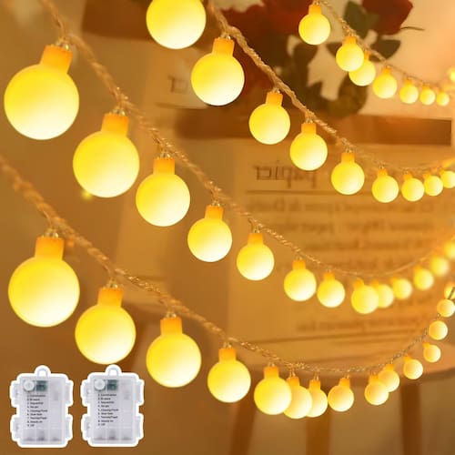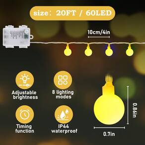 Luzes de fadas operadas por bateria para ambientes internos e externos, 6 m, 60 LEDs, globo de luzes com temporizador, 12 modos de luzes para quarto, sala de aula, acampamento, decorações de casamento - Tamanho do produto: cordão de luzes de 10 m e 120 contas de LED, o cabo de extensão extra tem 1,8 m de comprimento, as contas têm 0,7 pol de diâmetro e espaçadas de 10 cm, com revestimento de plástico e cabo, os produtos são mais resistentes e à prova de vandalismo. - 8 modos de iluminação: as luzes de corda de fadas têm modos de iluminação para diferentes ocasiões, modos: combinação, ondas, sequencial, slo-glo, perseguição/flash, desvanecimento lento, cintilante/flash, estável, para atender às preferências de diferentes pessoas, há também quatro brilho ajustável como uma luz noturna para o quarto do bebê. - Luzes de corda com temporizador: depois de selecionar o modo de luz para ligar a função de temporizador, ele continuará funcionando por 6 horas e depois desligará, desligará por 18 horas e liga ao mesmo tempo no dia seguinte, para economizar energia quando não for necessário e aumentar o tempo de trabalho mais longo. - IP44 Waterpoor: as luzes de fada à prova d'água têm IP44 à prova d'água, o globo de luz e a caixa de bateria são à prova d'água com nova tecnologia para atender ao uso prolongado de ambientes internos e externos, também são à prova de neve, à prova de sol e adaptáveis a todos os tipos de clima natural. Pode ser utilizado para jantar ao ar livre, casamento, acampamento e assim por diante. - Amplamente utilizado: as luzes de corda podem ser usadas para decoração interna ou externa. As luzes criam uma atmosfera festiva. Ideal para decoração de ambiente em seu quarto, sala de estar, varanda, jardim, pátio, tenda, toldo, hotel, etc