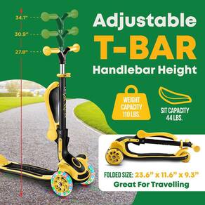 SCOOTER INFANTIL — torne o ciclismo muito divertido para seu filho com nossa scooter 2 em 1, que oferece uma opção de andar em pé e uma opção sentada, graças ao assento dobrável integrado. O design da scooter de 3 rodas oferece estabilidade premium em rodas deslizantes supersuaves e duradouras que piscam quando em movimento!