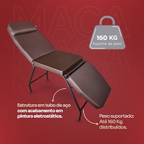 Conforto superior: estofado macio e suporte ergonômico para longas sessões. Espuma densidade d 28 com 5 cm de espessura Durabilidade: construída com materiais de alta resistência para garantir uma longa vida útil. Praticidade: por conta das suas regulagens proporciona várias posições para atender os mais diversos tipos de procedimentos. Possui regulagens de aço galvanizado com corte a laser, sendo 5 níveis de regulagens no encosto e 4 níveis de regulagens nos pés. Estilo moderno: design elegante que complementa qualquer ambiente de trabalho. Peso suportado: até 160 kg distribuídos.