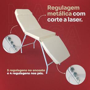 Conforto superior: estofado macio e suporte ergonômico para longas sessões. Espuma densidade d 28 com 5 cm de espessura Durabilidade: construída com materiais de alta resistência para garantir uma longa vida útil. Praticidade: por conta das suas regulagens proporciona várias posições para atender os mais diversos tipos de procedimentos. Possui regulagens de aço galvanizado com corte a laser, sendo 5 níveis de regulagens no encosto e 4 níveis de regulagens nos pés. Estilo moderno: design elegante que complementa qualquer ambiente de trabalho. Peso suportado: até 160 kg distribuídos.