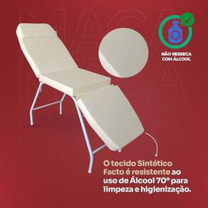 Modelo: maca 3 posições reclinável Estofado : de alta qualidade no tecido facto, o tecido facto é resistente ao uso de álcool 70 para limpeza e higienização. Material: estrutura aço com pintura eletrostática e mdf estofado Funcionalidade: ideal para estética, massagem, podologia e tattoo Dimensões: 75 alt. 54 larg. 180 comp. Cm Peso: 20 kg