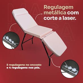 Conforto superior: estofado macio e suporte ergonômico para longas sessões. Espuma densidade d 28 com 5 cm de espessura Durabilidade: construída com materiais de alta resistência para garantir uma longa vida útil. Praticidade: por conta das suas regulagens proporciona várias posições para atender os mais diversos tipos de procedimentos. Possui regulagens de aço galvanizado com corte a laser, sendo 5 níveis de regulagens no encosto e 4 níveis de regulagens nos pés. Estilo moderno: design elegante que complementa qualquer ambiente de trabalho. Peso suportado: até 160 kg distribuídos.