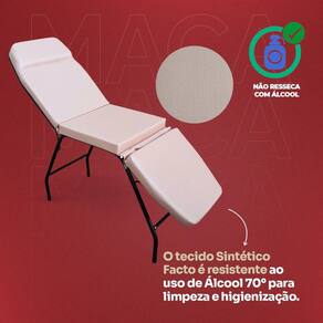 Modelo: maca 3 posições reclinável Estofado : de alta qualidade no tecido facto, o tecido facto é resistente ao uso de álcool 70 para limpeza e higienização. Material: estrutura aço com pintura eletrostática e mdf estofado Funcionalidade: ideal para estética, massagem, podologia e tattoo Dimensões: 75 alt. 54 larg. 180 comp. Cm Peso: 20 kg