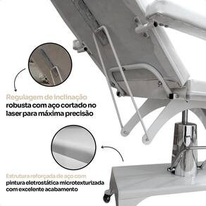 * Conforto Superior: Estofado macio com espuma D28 e espessura de 5 cm, garantindo bem-estar durante longos atendimentos * Ajustes Personalizados - Pés bipartidos que se movimentam separadamente - Sete níveis de regulagem nos pés para máxima adaptação, sendo 3 posições negativas para o cliente deitar de bruços - Cinco níveis de inclinação no encosto para diferentes posições * Orifício para Rosto: Proporciona mais conforto em atendimentos de bruços * Apoios de Braços Removíveis: Praticidade para ajustar conforme a necessidade * Durabilidade Excepcional - Regulagem de inclinação robusta com aço cortado no laser para máxima precisão - Borda de borracha nas três partes, aumentando a resistência e segurança - Rodízios em gel reforçados e com travas * Estilo Moderno: Visual sofisticado que agrega valor ao ambiente profissional