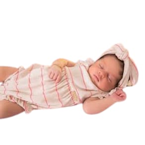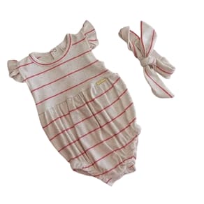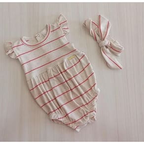 Lindo macacão em malha canelada, com faixinha de cabelo com elástico ajustavel a cabecinha da bebê, tecido leve e delicado, fechamento na parte de baixo e atrás em botões de pressão, para fascilitar a troca, elástico confortável na abertura das pernas para não machucar o bebê.