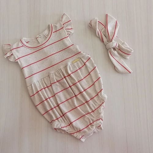 Lindo macacão em malha canelada, com faixinha de cabelo com elástico ajustavel a cabecinha da bebê, tecido leve e delicado, fechamento na parte de baixo e atrás em botões de pressão, para fascilitar a troca, elástico confortável na abertura das pernas para não machucar o bebê.