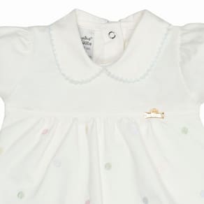 100% Algodão: Maciez e conforto incomparáveis. Super Confortável e Maleável: Perfeita para brincadeiras e momentos de descanso. Praticidade: Possui botões na parte inferior e nas costas para facilitar a troca de fraldas e o vestir. Estilo: Uma peça linda e delicada, com bordado de bolinhas coloridas, que deixarão sua bebê ainda mais estilosa.