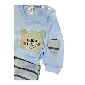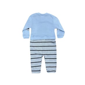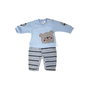 O Macacão Bebê Menino Ursinho Azul Claro - Brotinhos é composto por suedine azul claro na parte de cima com detalhes nos cotovelos da mesma cor da parte da calça. Além disso, possui botões de pressão na gola que facilitam a colocação e bordado de ursinho. Já a parte da calça, foi fabricada em moletinho careca com listras em tons de azul e cinza. Possui botões de pressão entre pernas.