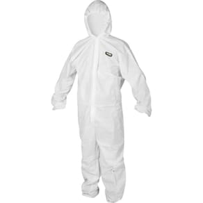 Macacão de segurança confeccionado em tecido de polipropileno laminado com filme de polietileno respirável. Conta com capuz, zíper na parte frontal e elásticos nos punhos, cintura, tornozelos e capuz.