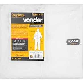 Macacão de segurança confeccionado em tecido de polipropileno laminado com filme de polietileno respirável. Conta com capuz, zíper na parte frontal e elásticos nos punhos, cintura, tornozelos e capuz.