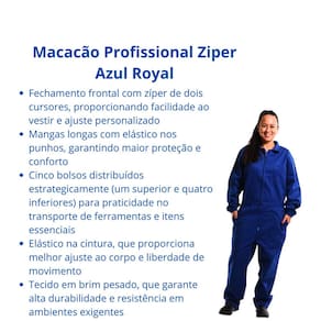 O Macacão em Brim Pesado foi desenvolvido para oferecer resistência, conforto e praticidade no dia a dia de trabalho. Com fechamento por zíper de dois cursores, mangas longas com elástico, 1 bolso superior e 4 bolsos inferiores, e elástico na cintura, é ideal para profissionais que atuam em ambientes exigentes.