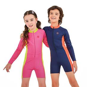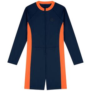 O macacão infantil marinho com faixas laranja neon da Kamylus é a escolha ideal para garantir conforto, estilo e proteção nas aventuras de praia e piscina. Possui modelagem prática com zíper frontal e mangas longas, facilitando na hora de vestir e garantindo maior proteção. É também perfeito para natação.