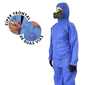 Macacão de segurança confeccionado em tecido não tecido (TNT) de polipropileno SMS, capuz de três peças com elástico, fechamento frontal com zíper bidirecional e aba protetora, elástico no punho para ajuste no dedo polegar, elástico na cintura, punhos e tornozelos.
