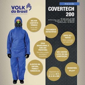 Informações técnicas Marca: Volk do Brasil Modelo: Covertech 200 Material: Tecido SMS respirável Tamanho: EP, P, M, G, EG, EEG Resistência química: Tipo 5 Costura: Simples Gramatura: 50 g/m² Formato: Macacão com capuz Descartável CA: 39.299