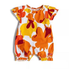 Um macacão solar, fresquinho, manguinhas soltinhas: perfeito para os dias mais quentes. Nas costinhas tem elástico: ajuda muito na hora de vestir. As manguinhas, sobrepostas, charme total. As perninhas com elásticos e botões entre elas. Maravilhoso.