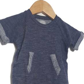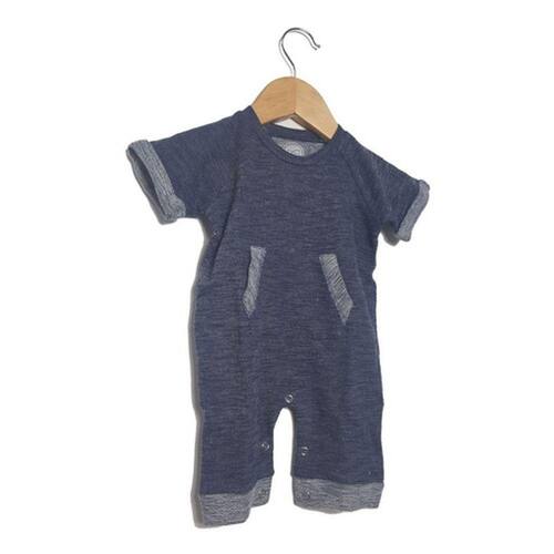 Esse pequeno macacão é gostoso, quentinho, macio. A malha é uma delícia. O corte é moderninho com bolsinho na parte da frente, manga curta e botões de pressão entre as pernas e no ombro direito que facilitam muito a hora troca. A padronagem lembra jeans estonado. A barra da perninha, a manga e a barra do bolsinho são em tom contrastante.