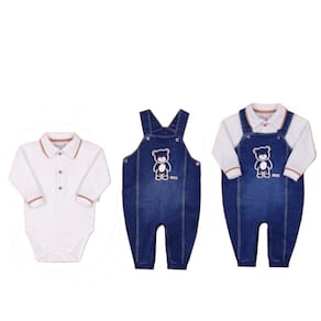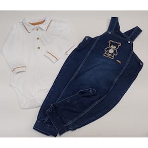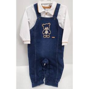 Características do Produto: - Macacão jardineira em jeans super macio e confortável. Detalhe em lavação estonada. Na frente com bordado de ursinho e plaquinha da marca aplicada que dão um charme especial a peça. Fechamento das alças por botões de pressão na frente e abertura lateral. Na parte inferior abertura por botões de pressão entre pernas, facilitando a vestimenta. Simplesmente um encanto! - Body em manga longa em malha 100% algodão, super macio e confortável. Detalhe ribanado nos punhos e na gola. Abertura por botões de madeira na frente até o meio e no fundo por botões de pressão.
