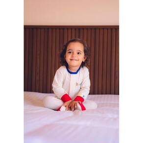 Macacão Magnético Off, detalhes vermelho e azul royal com letras e números nas mangas - 6 meses