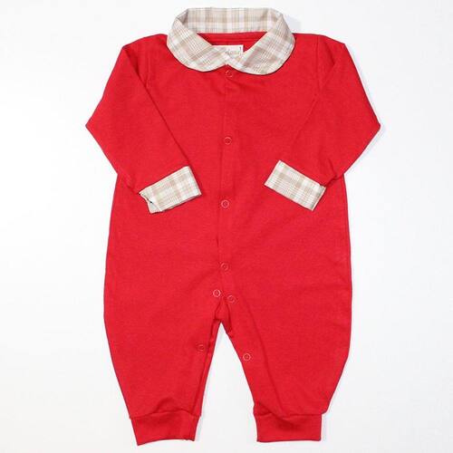 Macacão de bebê menino cor vermelho com detalhe xadrez bege, confeccionado em malha 100% algodão. O macacão para bebê é uma roupinha muito útil, pois quando o bebê esta vestindo um macacão ele estará pronto para qualquer atividade, além de deixar seu príncipe super confortável. Disponível nos tamanhos RN, P, M e G.