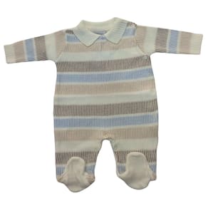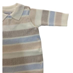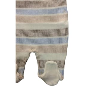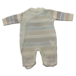 Macacão maravilhoso no tricot, todo trabalhado, 100% acrílico. Cor off white com listras em cores leves, um luxo. Noruega é tudo de bom!! Perfeito para deixar seu bebê ainda mais lindo. Coleção inspirada em cores e materiais do Brasil e Europa.Tudo pensado e desenvolvido com muito carinho.