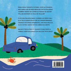 Com um macaco trocamos o pneu, mas se o macaco for daqueles com rabo, que pula de galho em galho, de nada vai nos servir o estepe. Brincar com as palavras não tem regras, o que vale é a imaginação neste livro de Renata Bueno e Sinval Medina para dar risada e quebrar a cabeça. Em cada virada de página, você vai encontrar versos divertidos e inusitados que brincam com o sentido das palavras. Não dá para confundir a manga da blusa com a manga da fruteira, não é mesmo? E se um dia você estiver na rua de guarda-chuva e avistar um guarda na chuva? Também existem palavras que se transformam quando são quebradas. Dentro do soldado, tem um sol e um dado, mas é impossível um dado marchar no sol. Vibrantes e coloridas, as ilustrações de Duda van den Berg trazem mais uma camada de leitura ao criarem cenas e situações vividas pelas personagens, correndo paralelas aos versos de Renata e Sinval. Indicado para leitores a partir de 4 anos.