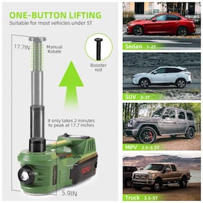 O macaco de carro de alto desempenho EFFIROSO pode alcançar um peso máximo de elevação de 5 toneladas e uma faixa de altura de elevação de 15 a 53 centímetros. Substitui as ferramentas tradicionais de troca de pneus trabalhosas. O kit completo de troca de pneus inclui um macaco de 5 Toneladas para elevação automática, inflador embutido de 150 PSI para enchimento rápido de pneus. A chave de impacto elétrica permite a instalação eficiente de parafusos de pneus. Mesmo iniciantes podem trocar pneus facilmente. Adaptação a Ambientes Hostis: O motor pode operar normalmente dentro da faixa de temperatura de -15°C a 50°C, garantindo operação confiável em condições extremas, incluindo áreas de grande altitude, costeiras e extremamente frias. Operação em Um Toque: Economize tempo e esforço, o sistema de controle instantâneo completa a elevação do carro em apenas 2 minutos, aumentando significativamente a eficiência em comparação com os macacos manuais tradicionais.