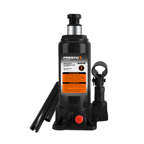 O Macaco Hidráulico Tipo Garrafa 3 toneladas da Presto é ideal para levantar veículos de porte médio de forma segura e eficiente. Compacto e robusto, é uma ferramenta essencial para oficinas mecânicas, borracharias e garagens. Sua construção em aço de alta resistência garante durabilidade e confiabilidade, mesmo em condições de uso intenso.