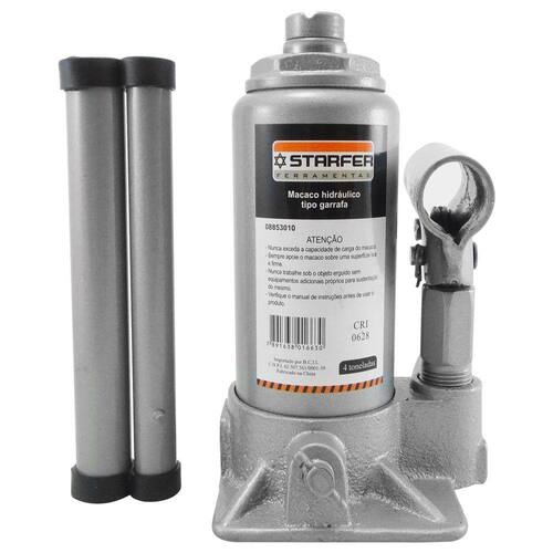 Macaco Hidraulico 4 Toneladas Tipo Garrafa Macaco Hidráulico redutor de esforço para elevação de veículos. O macaco suporta até 4 toneladas. Eficiente e resistente. De alta qualidade.- Marca: STARFER- Levanta até 4 toneladas- Super prático e resistente- Reduz o esforço durante troca de pneus ou manutenção- Altura mínima: 158 mm- Curso do Pistão: 90 mm- Comprimento máximo do Macaco a partir do chão: 30,8 cm- Dimensões na caixa: 19 cm x 12 cm x 12 cm- Peso bruto: 2,6 Kg