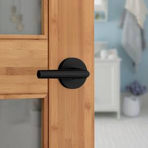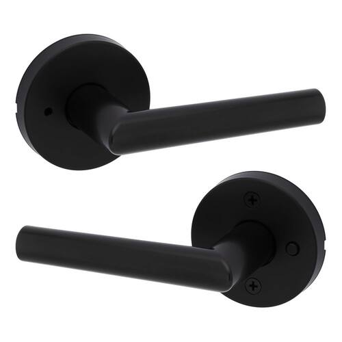 Kwikset Maçaneta de porta de privacidade interior Milan com fechadura, maçaneta de porta para banheiro e quarto, preto fosco reversível maçaneta de porta com botão de pressão sem chave