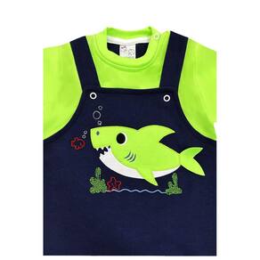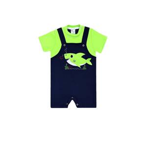 Nosso Macaquinho Jardineira Bebê Menino Tubarão Azul Marinho e Verde Neon - Brotinhos vai deixar seu príncipe ainda mais fofo! A peça é um macaquinho, porém imita uma jardineira. A parte da jardineira foi fabricada em suedine azul marinho, possui botões de pressão nas alças e entre pernas que facilitam a hora da troca. Conta também com bordado de um tubarão no fundo do mar. Sua nadadeira é uma linda aplicação em 3D, combinando com a cor verde neon da "blusinha". Já a parte debaixo que imita uma blusinha, possui também botões de pressão na gola.